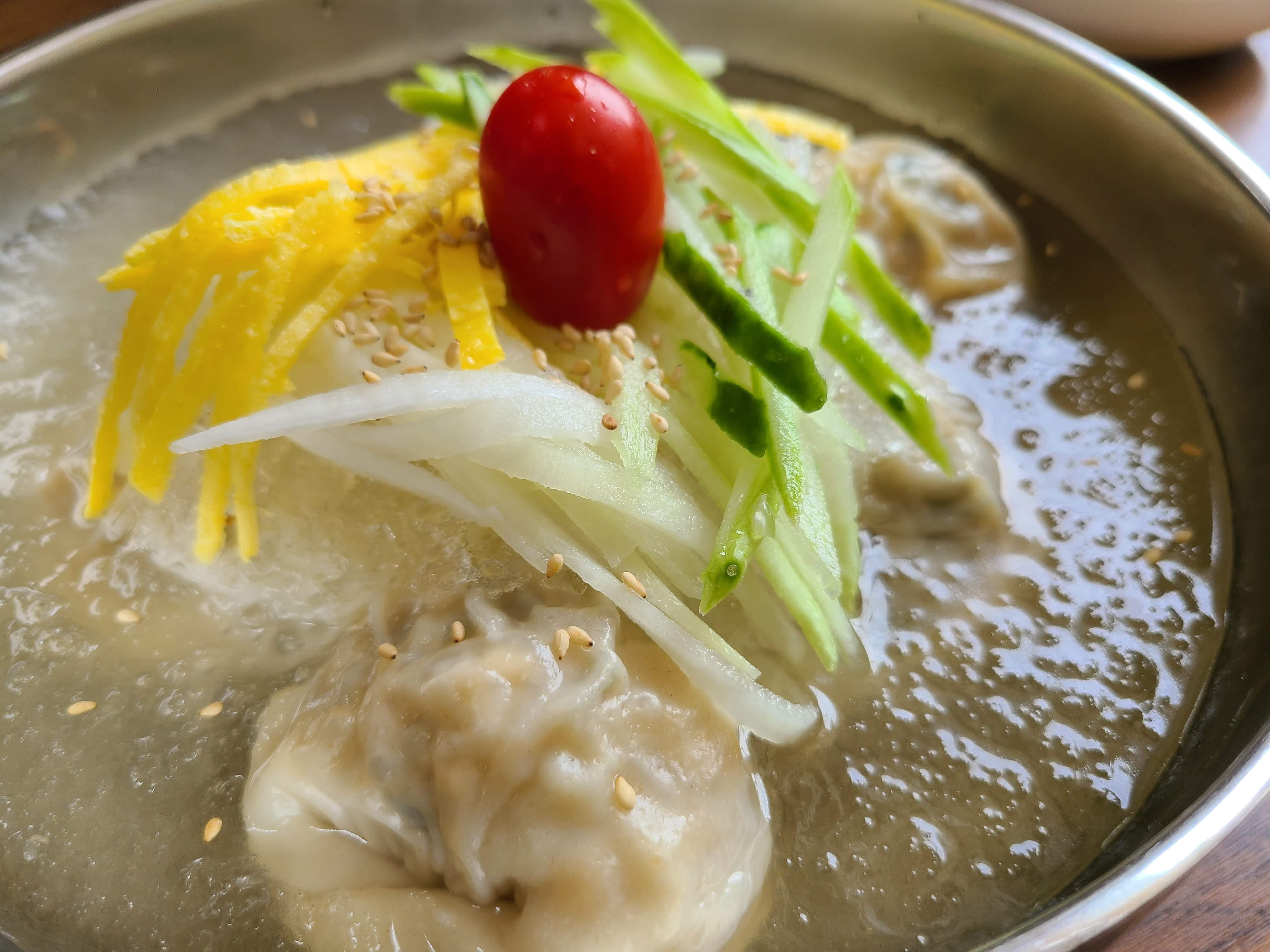 정말로 다른 경험이었습니다. 시원한 동치미 국물에 만두와 면을 함께 넣어 주셨어요. 면은 소면인데 면도 맛있습니다.